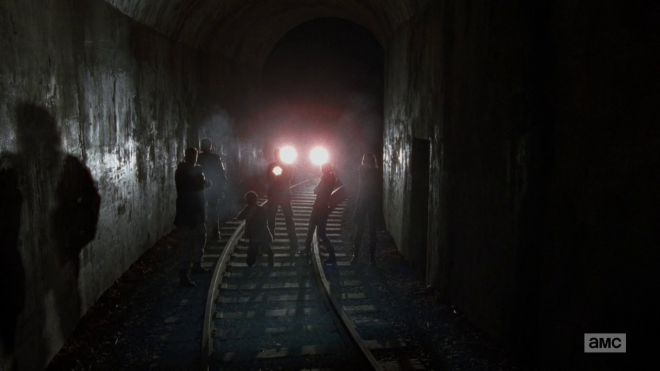 Der interessanteste bzw. aufschlussreichste Storypart war diesmal der von Glenn, Tara und der Gruppe um Abraham. Nachdem in der letzten Episode noch gezeigt wurde, dass Glenn nun auch den Weg zum Terminus anstrebt, finden sie nun Hinweise darauf, dass Maggie dort ebenfalls hin will. Allerdings kommen sie unterwegs auf den Schienen zu einem Tunnel, den Abraham fuer zu gefaehrlich haelt (er fuerchtet um Eugene, der ja nach DC muss, weil er die Welt retten kann) und so trennt sich die Gruppe vorerst auf. Im Tunnel stossen Glenn und Tara schnell auf eine Huerde, denn auf der Haelfte (oder so) ist die Decke eingestuerzt und hat einige Walker unter sich begraben. Die sich nun immer noch nach Nahrung sehnen und den beiden entsprechend nach dem Leben trachten. Mit etwas List schafft Glenn es, sie abzulenken, aber Tara klemmt ihr Bein im Schutt ein und ist nicht in der Lage weiterzugehen. Kurz bevor die Hoelle losbricht, kommen allerdings alte Bekannte von der anderen Seite des Tunnels und ballern den Weg frei. Nach diesem extrem coolen Auftritt (siehe Bild oben) gibt es auch ein sehr ruehrendes Wiedersehen von Maggie und Glenn, denn statt auf Glenn und Tara trafen Abraham und co. auf der anderen Seite des Tunnels auf Maggie, Sasha und Bob. Gemeinsam macht sich die nun mittlerweile 8-koepfige Gruppe in Richtung Terminus, wo sie dann zum Ende der Episode auch endlich ankommen. Aus dem Off kommt ironischer Weise Be not so Fearful von AC Newman, dessen Text zwar irgendwie hoffnungsvoll klingt, aber im Hinblick auf das etwas zu idyllische Innenleben des Terminus doch eher verdaechtig ist.