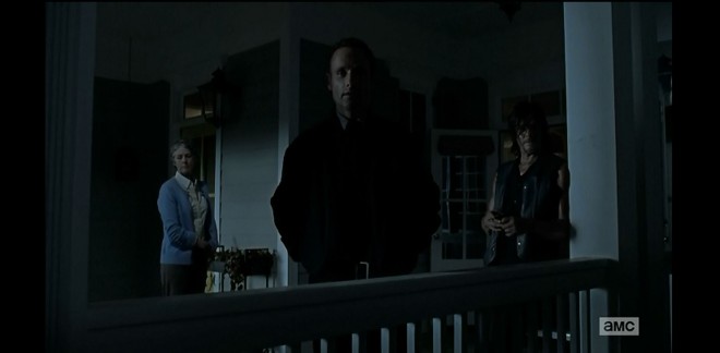 Zu guter Letzt bleibt dann natuerlich noch das Ende zu erwaehnen, das mit Rick aus dem Off ueberlagert wird, der waehrend des Interviews erzaehlt, dass man Fremde draussen nur noch daran misst, wie gefaehrlich oder hilfreich sie fuer die Gruppe sein koennten, dass jeder nur noch ans eigene Ueberleben denkt. Abgeschlossen wird die Szene mit Ricks Aussage, dass sie Alexandria uebernehmen koennten wenn die andere Gruppe tatsaechlich so schwach ist wie sie scheint. Passend dazu posieren Carol und Daryl symbolisch fuer Gut und Boese zu seiner Linken und Rechten.